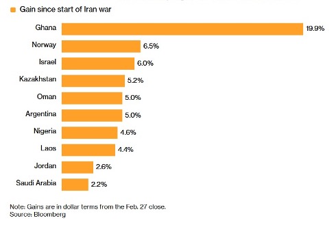 Ghana’s world-leading 20% stock index gain, tops 92 indexes tracked by Bloomberg. Only 11 other indexes have made gains in the month of March, with South Africa’s FTSE/JSE All Share Index, which lost 20%, being the weakest performer in dollar terms.